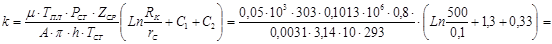 Коэффициент проницаемости k. Известны такие параметры, как ТПЛ = 303 К, коэффициенты несовершенства скважины С1 = 1,3 и С2 = 0,33; коэффициент сверхсжимаемости ZCP = 0,8; радиус скважины rC = 0,1 м; радиус контура питания RK = 500 м; эффективная толщина пласта h = 10 м; вязкость газа в пластовых условиях μПЛ = 0,05 мПа*с. А также ТСТ = 293, РСТ = 0,1013 МПа. Из таблицы №7.5. возьмем значение РПЛ = 6,04 Мпа.