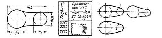 Конфигурацию сечения скважины по профилеграмме определяют графически (рис. 3). Такое построение дает лишь приближенное представление о конфигурации сечения скважины. Легко заметить, что наиболее узкая часть желоба не всегда контролируется диаметром замкового сечения. В зависимости от положения центра прибора в скважине (возможность смещения которого заложена в его конструкции) форма сечения может существенно меняться при одинаковых значениях dc. б и dc. м (рис. 4)