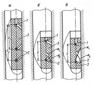 Рис 6. Зонды СГГК. а — двойной, б - двухлучевой. в — каплевидный; 1 — детектор; 2 — источник; 3 — экран; z, z1, г2 — длина зонда; x1, х2 — углы коллимации