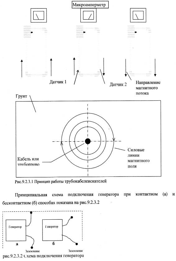 При контактном способе электромагнитное поле вокруг кабеля (трубопровода) создается присоединяемым к нему генератором, а при бесконтактном – без непосредственного подключения генератора к исследуемой трассе, или без применения генератора в зоне действия блуждающих токов необесточенных стальных трубопроводов и кабелей.