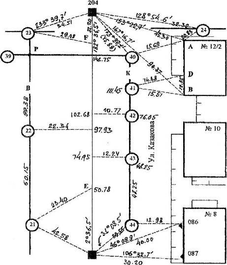 Определение положения (координаты) смотровых колодцев канализационной и водопроводной сетей, расположенных на участке застроенной территории. Результаты соответствующих измерений представлены в абрисе (рис. 7.3.1).