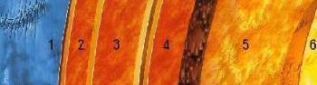 Цифрой 1 на рисунке обозначена земная кора (внешняя оболочка), толщина которой изменяется от нескольких километров (в океанических областях) до нескольких десятков километров (в горных районах материков). Сфера земной коры очень небольшая, на ее долю приходится всего около 0,5% общей массы планеты. Основной состав коры - это окислы кремния, алюминия, железа и щелочных металлов. В составе континентальной коры, содержащей под осадочным слоем верхний (гранитный) и нижний (базальтовый), встречаются наиболее древние породы Земли, возраст которых оценивается более чем в 3 млрд. лет. Океаническая же кора под осадочным слоем содержит в основном один слой, близкий по составу к базальтовым. Возраст осадочного чехла не превышает 100-150 миллионов лет.