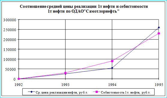 На рис. 4.1 (а) отражено соотношение средней цены реалиции одной тонны нефти и себестоимости 1т нефти по ОДАО"Самотлорнефть". График показывает, что уже в процессе реализации заложены убытки в 1992 - 1994 гг., т.к. этот период характеризуется превышением затрат на добычу нефти над уровнем цены реализации нефти. В 1995 г. нефть реализовалас по цене, превышающей затраты на ее добычу.