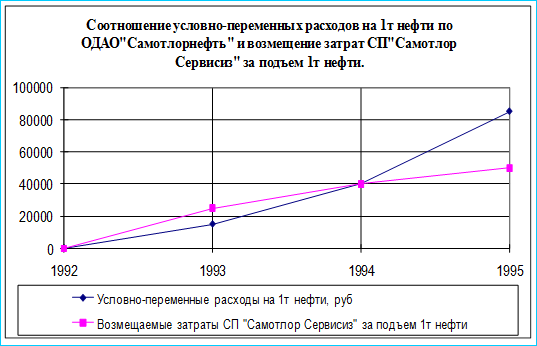 На рис. 4.1 (б) отражено соотношение условно-переменных расходов и возмещаемых затрат СП "Самотлор Сервисиз" не покрывали тех затрат, которые несло ОДАО"Самотлорнефть" за подъем той части дополнительно добываемой нефти, которая по договору распределялась в пользу СП.