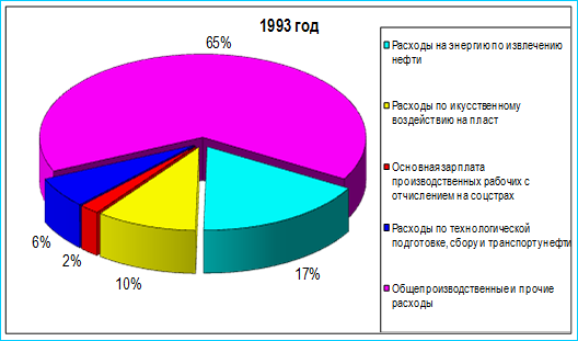 На рис. 4.2 отражено изменение соотношения основных составляющих условно-переменных затрат на добычу нефти в 1993-1995 гг. Заметно, что в 1995 году произошло существенное увеличение расходов на энергию по извлечению нефти, и расходов по искусственному воздействию на пласт, связанных в первую очередь с увеличением тарифов на электроэнергию и с увеличением объемов работ по повышению пластового давления, что во многом обусловлено проведением ГРП. Например, расходы на энергию по извлечению нефти увеличилась с 1994-го по 1995 год в 4.3 раза, расходы по технологической подготовке, сбору и транспорту нефти - в 3.3 раза, основная зарплата производственных рабочих - в 2 раза, общепроизводственные и прочие расходы - в 2.6 раза.