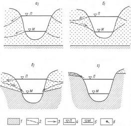 Схема взаимодействия речных и грунтовых вод: а - постоянная односторонняя гидравлическая связь, б - постоянная двусторонняя гидравлическая связь, в - временная гидравлическая связь, г - отсутствие гидравлической связи. 1 - водоупорный пласт, 2 - уровень грунтовых вод, 3 - направление движения грунтовых вод, 4 - уровень воды в реке в половодье, 5 - уровень воды в реке в межень, 6 - источники (родники). |