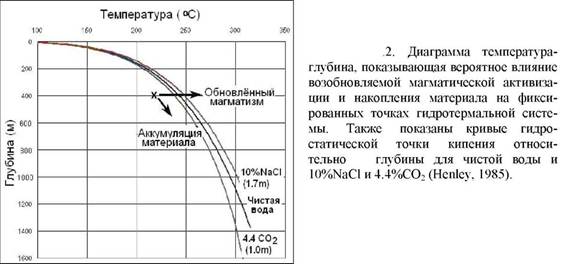 При обновлённом магматизме, профиль, описывающий положение точки кипения в зависимости от глубины, обычно превышает реальное давление, таким образом, катастрофические фреатические взрывы происходят на дневной поверхности и сопровождаются гидротермальным брекчированием и кипением в недрах системы. Внезапное кипение и отделение газа приводит к дестабилизации бисульфидных комплексов и отложению золота и других металлов в недрах системы. Наложение может сопровождать такое событие, но обычно продолжается дольше, после того, как гидротермальная система возвращается к стабильному температурному профилю точки кипения, соответствуя данным глубинным условиям. Это может требовать повышение зеркала подземных вод и/или уменьшению притока тепла в систему.