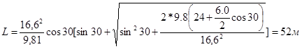 Дальность отлета струи L, отброшенной с трамплина, до встречи со свободной поверхностью нижнего бьефа определяется по формуле: