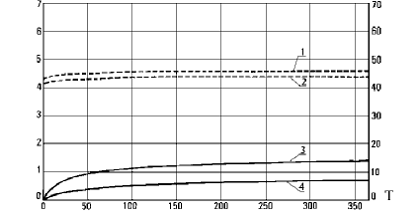 Рис.1.1 Зависимость сцепления С и трения j в швах УБ от времени Т (дни) при высоком и низком расходе вяжущих (Ц + З): 1 - зависимость j при высоком (Ц + З); 2 - то же при низком (Ц + З); 3 - зависимость С при высоком (Ц + З); 4 - то же при низком (Ц + З)