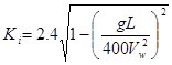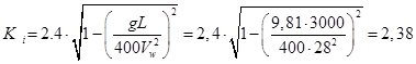 где aw - угол между направлением господствующего (расчетного) ветра и продольной осью водохранилища, град.; L - длина разгона волны по направлению господствующих ветров, м; Vw - расчетная скорость ветра на высоте 10 м над НПУ, м/с; H - условная расчетная глубина воды в водохранилище, м; g = 9,81 м/с2; K - безразмерный коэффициент, зависящий от скорости ветра Vw по формуле: