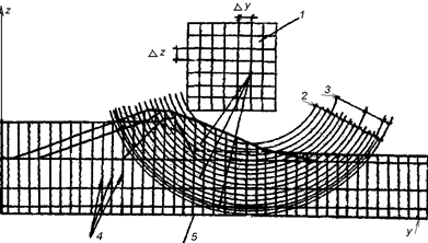 Рис. 2. Cхема к определению коэффициента запаса устойчивости откоса по кругло-цилиндрической поверхности скольжения: 1 - поле центров кругов скольжения; 2 - круги, проведенные с шагом ∆R; 3 - круги, касательные к слоям; 4 - ось элементарных отсеков (столбиков); 5 - нижняя граница расчетной области (поверхность грунта)