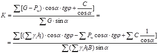 В расчете суммирование производится по всей длине кривой скольжения до пересечения ее с поверхностью грунта в правой и левой частях плотины. Расчет можно выполнить при двух вариантах определения давления в поровой воде