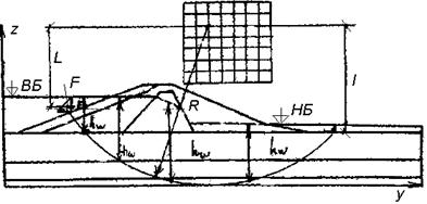Рис.3. Схема определения давления в поровой воде грунта основания и плотины в расчете устойчивости откосов; учет давления воды ВБ и НБ