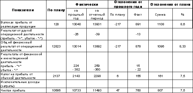 Из приведенных в таблице данных видно, что фактическая чистая прибыль увеличилась сравнительно с планом на 807,0 тыс. грн., или на 7,5%, причем весь прирост практически обеспечен за счет перевыполнения плана по прибыли от реализации товарной продукции (+1108 тыс. грн., или 8,6%). Убытки от другой операционной деятельности уменьшили чистую прибыль на 39 тыс. грн., или на 0,3% (39 х 100 / 12823). Убыточное сальдо от финансовой и инвестиционной деятельности привело к уменьшению чистой прибыли на 101,0 тыс. грн., или на 0,7%(101 х 100 / 12823). Однако, сравнительно с прошлым годом оно уменьшилось на 37,0 тыс. грн., или на 50%, возросли сравнительно с прошлым годом убытки от другой операционной деятельности.