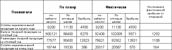 Из приведенных данных таблицы видно: сверхплановая прибыль от реализации товарной продукции составляет1108 тыс. грн., то есть на 8,6% больше плана. Перевыполнение плана прибыли от реализованной продукции увеличило прибыль на 1292 тыс, грн., в то время, как увеличение остатков нереализованной продукции на конец года уменьшило прибыль от реализации на 184 тыс. грн. Из-за этого в процессе анализа необходимо выяснить причины, по которым нереализованная продукция осталась на складе. Если в ходе изучения возрастания остатков будет установлено, что на предприятии большие остатки товаров не имеют спроса, необходимо определить, почему на них был заключенный договор и которая из сторон (заказчик или производитель) не выполнила условий договора и к кому будут применять экономические санкции.