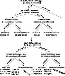Так как обломочные породы сложены обломками, то эти породы можно разделять по размеру слагающих их обломков. Если размер обломков менее 1 мм, это мелкообломочная порода. Если он более 1 мм, то это крупнообломочная порода. Мелкообломочные породы в свою очередь еще раз разделяются по размеру обломков. Если он до 0,1 мм, то порода алевритовой структуры. Если более 0,1 мм, структура породы псаммитовая.