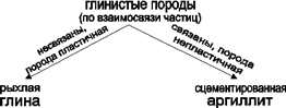 Сложены они частицами размером менее 0,01 мм, поэтому признак размера частиц, как и форма для них неприемлем. Остается только признак взаимосвязи частиц. Если глинистая порода пластичная, следовательно, частицы ее не связаны между собой, то это рыхлая порода. Если порода гладкая на ощупь и не пластичная, сжать ее нельзя, порода – сцементированная. Все исходные данные для определения глинистых пород получены.