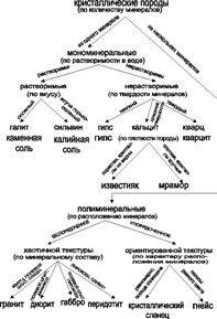 Порода, состоящая из кристаллов галита, называется каменная соль, а сильвина – калийная соль. Последняя обычно имеет участки красного или синего цвета. Породу, сложенную кристаллами гипса, называют также гипсом (часто содержит примесь глины, отчего цвет породы серый). Породу, сложенную кристаллами кварца, именуют кварцитом. Породы из кристаллов кальцита разделяются по плотности и размерам кристаллов. Если кристаллы не видны и порода пористая, то это известняк. Если кристаллы видны, расположены хаотично и порода плотная, то это мрамор.