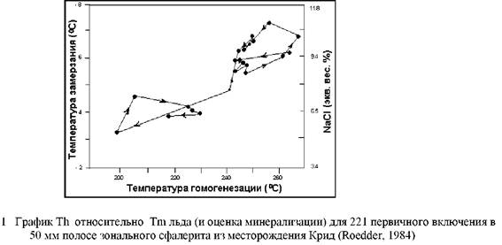 В этом разделе описаны типичные изменения, которые может пройти гидротермальная система в течение одного цикла, и рассмотрены возможные пути их исторического развития. Этот процесс имеет не только теоретическое значение. Материал базируется на наблюдениях реальных систем, часть которых связана с известными промышленными месторождениями. Так, например, на месторождении Крид в штате Колорадо в США, были выполнены детальные исследования по флюидным включениям, а «стратиграфия» была изучена по окраске полос обильно присутствующего в жилах сфалерита. Она позволила установить воздействие на систему контролирующего временного фактора (рис. 6.1). На этом месторождении можно распознать двадцать различных этапов отложения сфалерита. Эти данные показали процесс уменьшения минерализации и температуры во времени, в связи с чем можно высказать предположение о постепенном разбавлении и остывании первичных магматических флюидов. Они также свидетельствуют о двух циклах обновления гидротермальной системы, которые сопровождались несколькими более мелкими флуктуациями в режиме гидротермальных растворов.