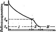 Водонасыщенность пласта уменьшается от максимального значения Svах, соответствующего конечной нефтеотдаче на начальной линии нагнетания воды, до значения насыщенности погребенной воды SП. При этом в пласте можно отметить три зоны (I, II и III). В первой из них, где водонасыщенность изменяется от Svах до Sф, на условном контуре вытеснения она плавно понижается по направлению к нефтенасыщенной части пласта. Этот участок характеризует зону водонефтяной смеси, в которой постепенно вымывается нефть. Второй участок (зона II) с большим уклоном кривой представляет собой переходную зону от вымывания нефти к зоне III движения чистой нефти. Эту зону принято называть стабилизированной. Длина ее в естественных условиях может достигать нескольких метров