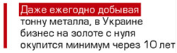 Пока украинский крупный бизнес не заинтересован в добыче золота. Основная причина - высокий риск инвестиций. Геологоразведка подтверждает большое количество драгметалла в украинских недрах. Однако при реальной добыче может оказаться, что золота в руде содержится намного меньше, чем предполагалось, или извлечь драгметалл из породы сложно и неоправданно дорого.