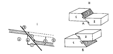 Рис. 3. Элементы сброса. Блоки (крылья): I - поперечный разрез: 1 - поднятый (лежачий), 2 - опущенный (висячий), 3 - сместитель; амплитуда: 4 - по сместителю, 5 -стратиграфическая, 6 - вертикальная, 7 - горизонтальная. II - А - сброс и Б - взброс. Обозначения одинаковы.