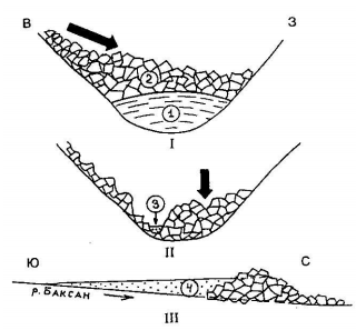 Рис. 1. Формирование вала Тюбеле в долине Баксана (Северный Кавказа) (по Е.Е.Милановскому и Н.В.Короновскому). I - верхнеплейстоценовый ледник в долине Баксана перекрыт обвалом гранитных глыб с г.Андырчи:1 -ледник, 2 обвал; II - ледник отступил и обвальная масса осела: 3 - современная р.Баксан; III - поперечный профиль обвала, выше которого сформировалось озеро (4), впоследствие спущенное. Черная жирная стрелка - место прорыва озера.