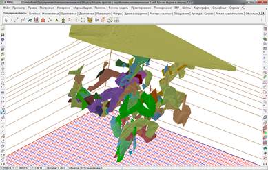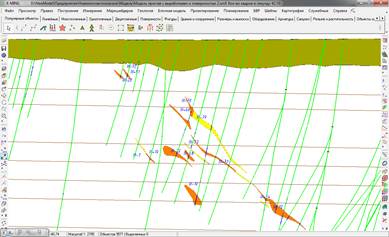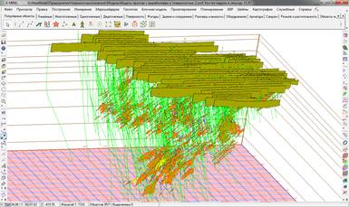 Подобным образом выполняется оконтуривание рудных тел для всех геологических профилей. После интерпретации данных они загружаются в трехмерное пространство для проверки правильности построения и увязки (рис. 4.) [5].