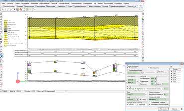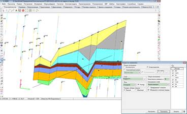В составе модуля геологического моделирования для нерудных полезных ископаемых интегрирован блок интерпретации данных в разведочных профилях. Блок содержит набор функций для построения геологических разрезов. Среди них функции геометрического построения с моделированием пород по чередованию сверху вниз, снизу вверх, по мощности пород, автовыбор, моноклинально с возможностью восстановления скважин по глубине по средним значениям мощности слоя и т.д. (рис. 8) [5].