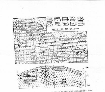 Рис. 7. Геологический план и разрез Рыжсковской площади (по данным Ивановской геологоразведочной экспедиции Красноярского геологического управления):