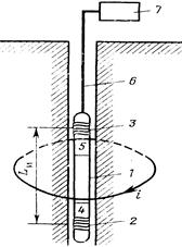 Рис. Принципиальая схема индукционного метода. 1-скважиный снаряд-зонд; 2-излучающая катушка; 3-приемная катушка; 4-генератор; 5-усилитель и выпрямитель; 6-кабель; 7-регистрирующий прибор