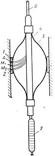 Рис. Схематический вид микрозонда. 1-изоляционная пластина; 2-электрод; 3-пружина; 4-корпус микрозонда; 5-груз; 6-кабель; А, М1, М2 – элекроды зонда.