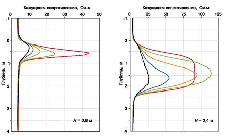 Рис. 3.10. Диаграммы для модели глина — уплотненный пласт — глина. Длина зонда, м: 0,5 — красный, 0,7 — зеленый, 1,0 — коричневый, 1,4 — синий, 2,0 — черный.