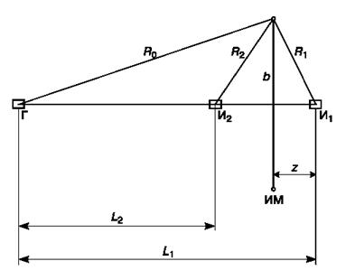 Здесь L1 и L2 — расстояния от из мерительных катушек И1и И2 до генераторной катушки Г, b — радиус кольца, Z — расстояние от плоскости кольца до измерительной катушки И1 ток в генераторной катушке изменяется по закону