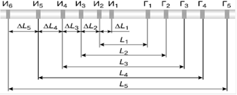 На рис. 2.1 показана схема размещения катушек на зондовом устройстве. Здесь принятые следующие обозначения: Г1, Г2, Г3, Г4, Г5 – генераторные катушки; И1, И2, И3, И4, И5, И6 – измерительные катушки.