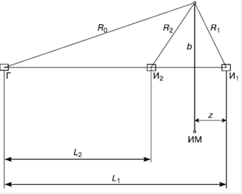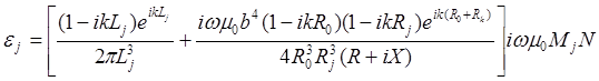 Здесь L1 и L2 – расстояния от имитирующих катушек И1 и И2 до генераторной катушки Г, b – радиус кольца, z – расстояние от плоскости кольца до измерительной катушки И1, ток в генераторной катушке изменяется по закону J = J0∙eiωt. Рабочая частота зонда ƒ = ω/2π. Комплексное сопротивление цепи кольца на рабочей частоте R + iX. Активное сопротивление R складывается из потерь в высокоомном проводе и в конденсаторе, включённом в разрыв цепи. Реактивное сопротивление X = 1/ωC – ωL. В этом случае ЭДС, наводимая в j-ой измерительной катушке, равна: