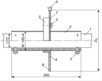 Собственно имитатор образован кольцом 7, выполненным из манганинового провода и закреплённым на электроизоляционном диске 4. Кольцо имеет два разрыва. В одном вставлен конденсатор 8, в другом – коаксиальный измерительный разъём 6. В рабочем состоянии этот разъём закорочен дисковым замыкателем с пренебрежимо малой остаточной индуктивностью (менее 10-10 Гн). При помощи болтов 5 диск с кольцом может быть соединён с фланцем 3, который укреплён на втулке 2 подвижным резьбовым соединением. Втулка 2 крепится на корпусе прибора 1 болтами 5. Для точной установки имитатора вдоль оси зонда вращают диск 4. При этом вращении фланец 3 и диск 4 с закреплённым на нём кольцом 7 будут перемещаться по резьбе вдоль закреплённой на корпусе втулки 2.