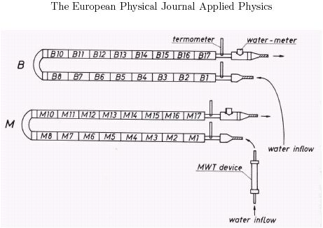 Для проведения эксперимента были сконструированы два идентичных контура В и М, моделирующие теплообменник электростанции. Каждый контур был изготовлен из 16 латунных секций (трубы 1 м длиной, внутренний диаметр = 30 мм, толщина стенки 1 мм) и согнутой части, помещенной в середине. Трубы нагревались перменным током, мощностью 1.5 кВт, используемым для каждой секции. MWT устройство было установлено на входе одного из контуров, обозначенного как М-контур. Схематическая диаграмма эксперимента приводится на Рисунке 1. Рисунок 2a представляет схему устройства. Прибор имел цилиндрическую симметрию и использовал пакет постоянных магнитов из феррита стронция, помещенных в ферромагнитную трубу.