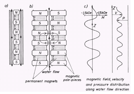 Кольца (постоянные магниты) были намагничены параллельно их осям симметрии. Диаметр полюсных наконечников был больше диаметра магнитов на 4 мм, благодаря этому скорость водного потока периодически изменялась (от 1.0 до 1.6 м/с) в дополнение к изменению профиля поля. Амплитуда поля составляла 120 кА/м (1.5 kOe[3]). Давление в потоке воды также периодически изменялось, характер этих изменений показан на Рисунке 2c.