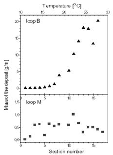 Рис.3. Количество отложений, как функция номера секции и/или температуры, извлеченных из контуров B и М после четырех месячного пробега.