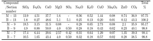 Можно отметить большие различия в содержании кремнезема, поташа (в форме K2O), железа (в форме Fe2O3), цинка (в форме ZnO) и медь (в форме CuO). Количество вышеперечисленных элементов в несколько раз выше для секций контура М, по сравнению с одноименными секциями контура B. С другой стороны, содержание кальция (в форме CaO) и магния (в форме MgO) ниже, чем в контуре М.