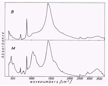 Чтобы объяснить происхождение аморфной фазы и идентифицировать образующее ее вещество мы проводили измерения поглощения в инфракрасной области спектра. Известно, что IR спектроскопия является мощным методом исследования минералов (безводных или гидратированных карбонатов, силикатов, и т.д.) и фаз с низким атомным порядком. Спектры были измерены для нескольких пар образцов. Результат для секции номер 7 (180C) представлен на Рисунке 7. Различия для контуров B и М очевидены, особенно в диапазоне с центром в 1050 cm-1 и в области 3000-4000 cm-1. Анализ спектров проведен в соответствии с [17,18]. Оказалось, что полоса 1050 cm-1 связана с гидрозолями кремнезема и ее интенсивность намного выше для отложений из контура М, то есть для обработанной воды. Поскольку гидрозоли кремнезема обладают сильным сорбционным свойством, в диапазоне 3000-4000 cm-1 должно наблюдаться существенное различие, обусловленное колебаниями молекул воды. Как можно видеть на рисунке 6, именно это фактически и происходит. Здесь отчетливо видна разность концентрации кальцита, что согласуется с результатами химического (Табл.1) и дифракционного анализа (Рис.6), а также измерениями PIXE (Рис.5). Различия концентрации металлов (Fe, Mn, Cu, Zn, .) приписываются сорбционным свойствам гидрозолей кремнезема.