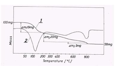 Контроль воды и содержания CO2 в отложениях после MWT проводился двумя независимыми способами. В качестве другого метода использовался термогравиметрический анализ (DTA) отложений из Блока 10 выполненный с использованием прибора Мётлера [Motler]. Кривая 1 на рисунке 8 иллюстрирует зависимость массы как функции температуры. Потеря воды (влажности) происходит при 1400C и сопровождается изменением массы Dm1 »19 %, потеря кристаллизационной воды происходит при 7500C и приводит к Dm1 »20 % и потере CO2, дальнейший нагрев в диапазоне 7500C – 8000C дает Dm1 »3 %. Кривая 2 иллюстрирует производную изменения массы. Таким образом, при различных методах исследования, в отложениях обнаруживается недостаток карбонатов. Вероятным объяснением малого количества CO2, обнаруживаемого методом DTA, может быть кристаллизация карбонатов до входа в блок.