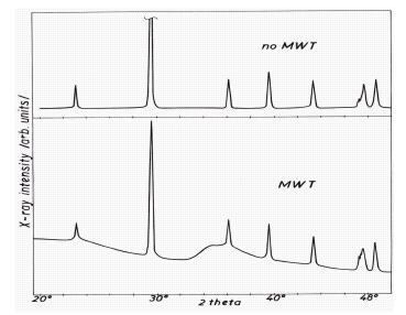 Пара рентгеновских дифракционных изображений для отложений без- и при магнитной обработке приводится рисунке 9. MWT спектр был получен рентгеновским детектором с высоким усилением сигнала. Необработанная вода показала низкий фон и сильные пики кристаллической фазы, идентифицированной как Mg-замещенный кальцит. Основная часть образца, полученного из обработанной воды, была аморфной субстанцией с небольшой величиной межатомных расстояний, что сопровождается высоким фоном и двумя широкими максимумами в сигнале образца. Отражения, исходящие от кальцита, дали приблизительно 5 % полной интенсивности.