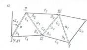 При развитии инженерно – геодезических сетей методом триангуляции наиболее типичными построениями являются цепи треугольников (для линейно протяженных объектов), центральные системы (для городских и промышленных территории), геодезические четырехугольники (для мостовых и гидротехнических сооружений), вставки пунктов в треугольники и небольшие сети из этих же фигур. Но возможны и комбинированные построения. В сетях триангуляции треугольники стараются проектировать близкими к равносторонним, в особых случаях острые углы допускаются до 20˚, а тупые – до 140˚. В свободных сетях для контроля масштаба сети необходимо иметь не более 2-х непосредственно измеренных базисных сторон. Решая последовательно треугольники от начальной стороны I-II (рисунок 1), находим все стороны системы треугольников. Если для точки I даны координаты х и у и дирекционный угол α˚ направления I-II, то из вычислений получаем дирекционные углы направлений всех сторон треугольников и координаты их вершин II, III, IV, V,…, называемых геодезическими пунктами или более конкретно пунктами триангуляции. Непосредственно измеряемая сторона I-II называются базисной стороной, а точка I, для которой задаются координаты и азимут стороны, - исходным пунктом триангуляции.