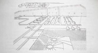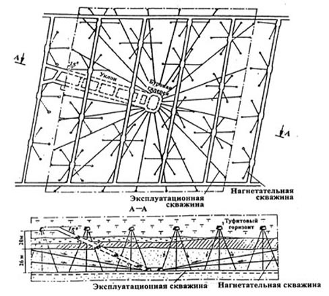 Разработка шахтным способом осуществлялась по двум системам (Рис. 3): 1) ухтинской, при которой залежь дренировали весьма плотной сеткой вертикальных или слегка наклонных скважин (глубиной до 50 м), пробуренных из горной выработки вышележащего туффитового горизонта, находящейся выше продуктивного пласта на 25 метров и 2) уклонно-скважинной – с расположением галерей в верхней части пласта и разбуриванием шестигранников (площадью 8–12 га) в подстилающем горизонте пологими скважинами длиной до 200 м., которые отходят от них как спицы колеса от оси.