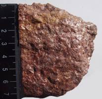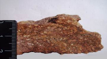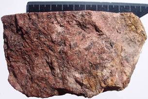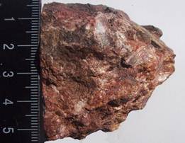 Мусковит-кианитовый сланец (шлиф № Б5) – порода красно-бурого цвета, равномерная окраска обусловленная развитием гематита по всей породе. Текстура породы сланцеватая благодаря ориентированным кристаллам кианита. Внешне структура породы порфиробластовая, обусловленная крупными зернами кианита.