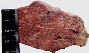 Мусковит-кианитовый сланец (шлифы № Б16-1, Б16-2) – порода плотная красно-бурого цвета с магнетит-гематитовыми прослойками черного цвета. Мощность слойков невыдержанна и достигает 1,5 мм. Текстура породы сланцеватая благодаря ориентированным кристаллам кианита. Внешне структура породы среднезернистая (зерна в породе до 7 мм).