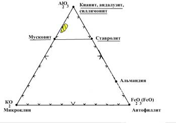 Рис. 20. Положение мусковит-кианитовых сланцев на диаграмме Al2O3-K2O-FeO*