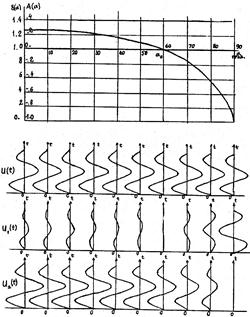 Для выбранных параметров разреза на рис.9 приведен единый график А (α) и В (α) = 1 + А (α), снабженный двумя шкалами оси ординат со смещенными на единицу нулями. В нижней части рисунка изображены схематические импульсоиды падающей волны u (t) и вторичных волн - отраженной